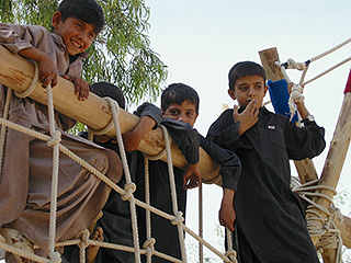 | この年にチトラルで設営したばかりの、新しいネットをよじ登る遊具も、ちゃんと再現されていた。上まで登ると、けっこう高度感があって、怖い。こういうちょっと危険な遊具が、やはり子どもたちに人気がある。[撮影:丸山純] |