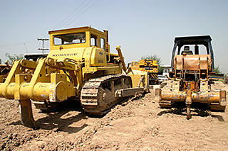 ペシャワル郊外の広大な空き地に、新旧のブルドーザーやショベルカーが何台も無造作に置かれている。しかし、ここはれっきとした中古建設機械の青空市場なのである。(撮影:丸山純) |